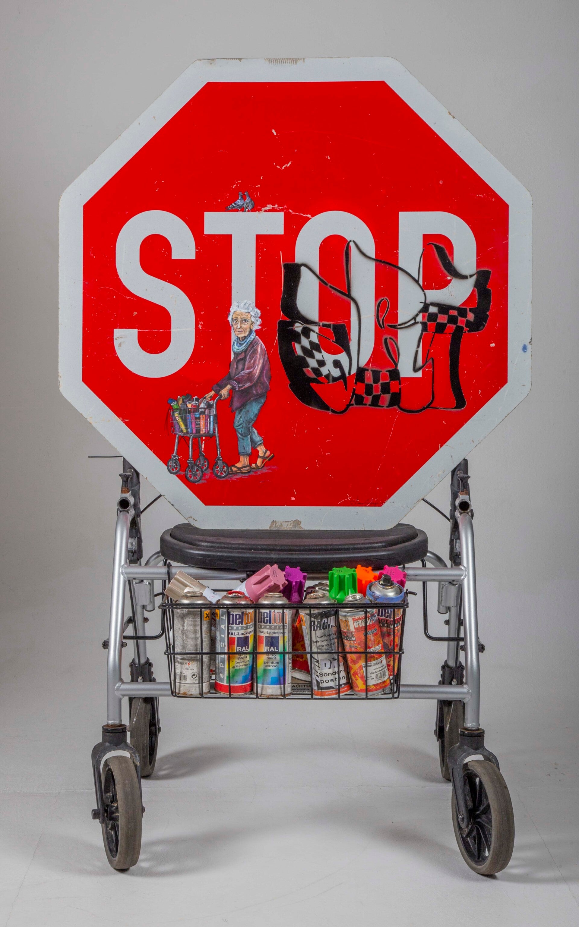 Acryl, goldenes Stickgarn und Buchstabenperlen auf Leinwand